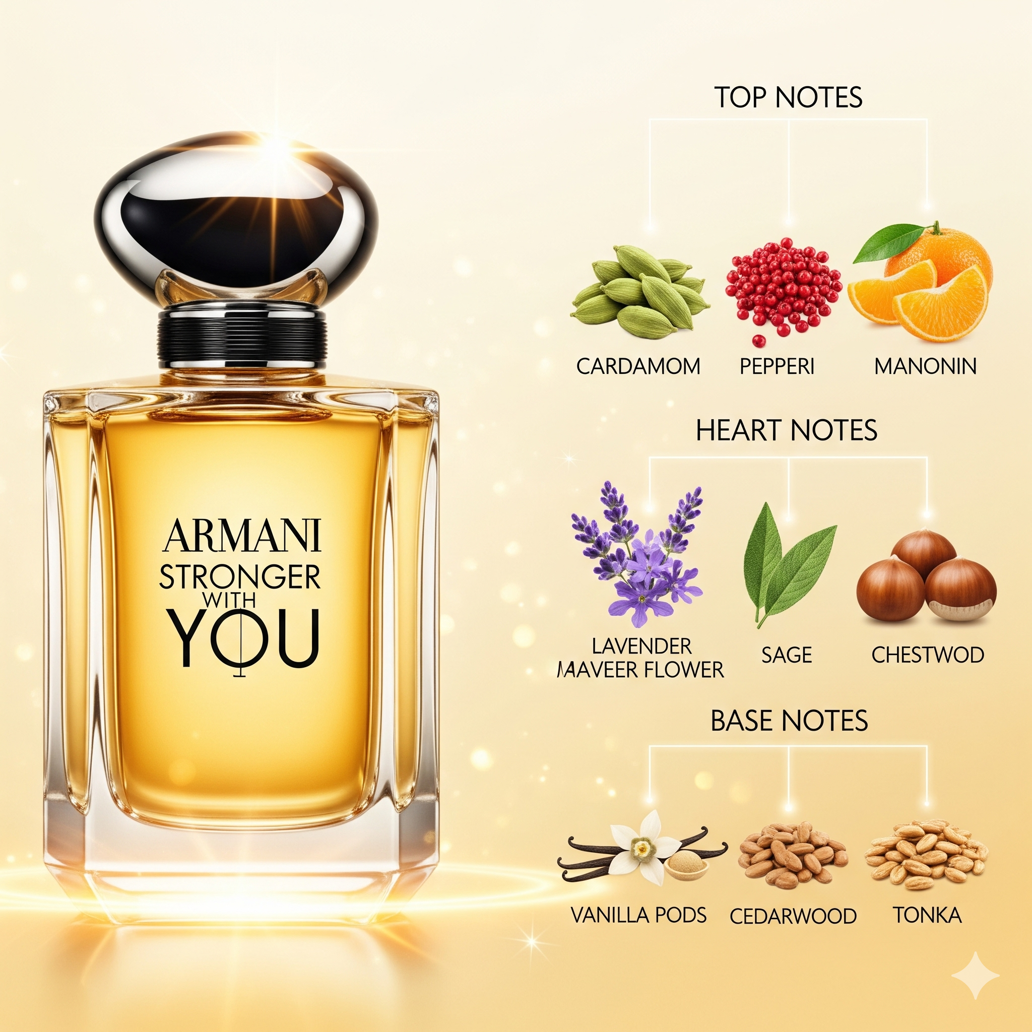 Armani Stronger With You – a modern blend of fresh spices, sweet vanilla, and warm woody notes that embody passion and confidence.