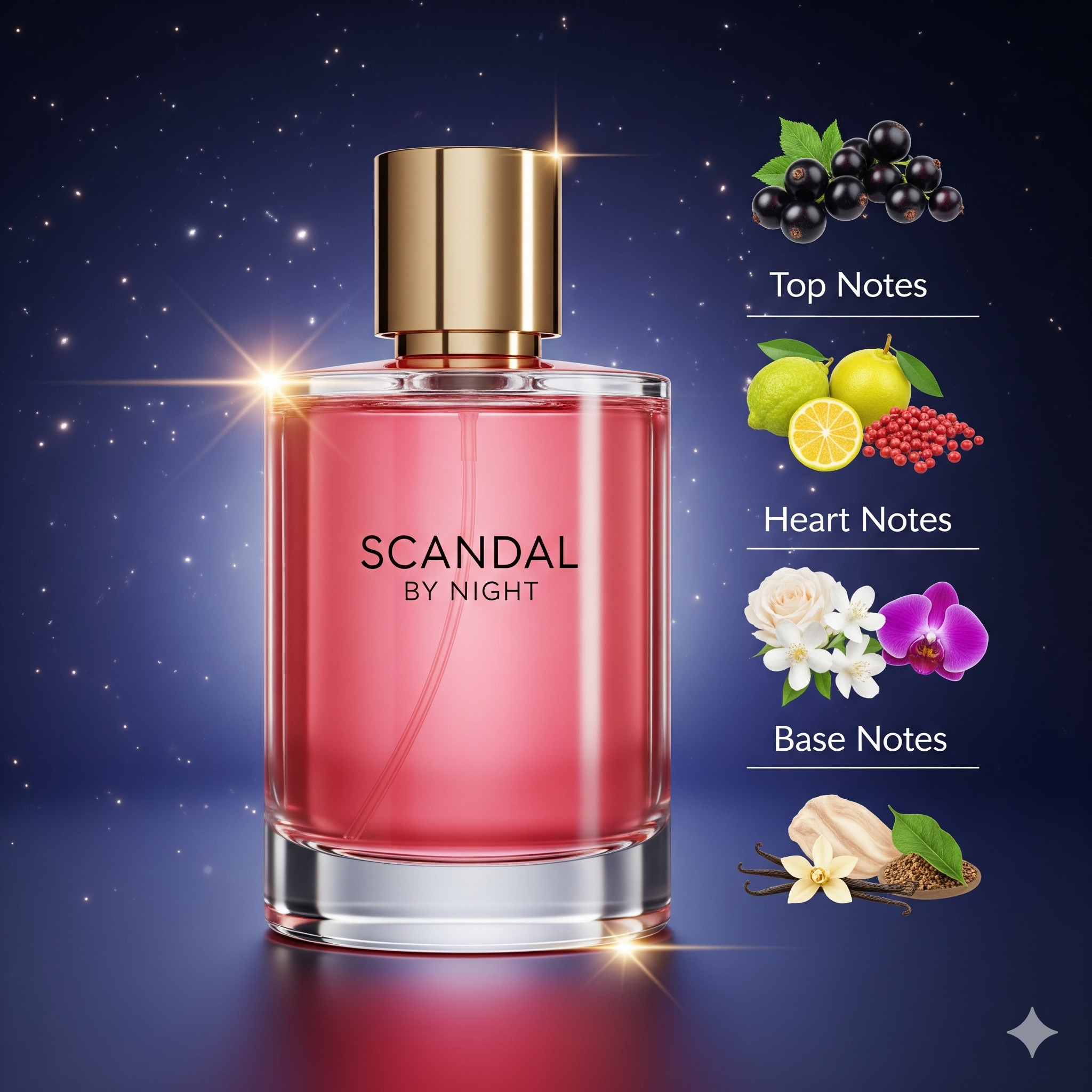 Scandal By Night – A bold, sensual, and mysterious fragrance with deep floral sweetness, perfect for late-night elegance and unforgettable charm.